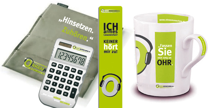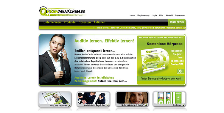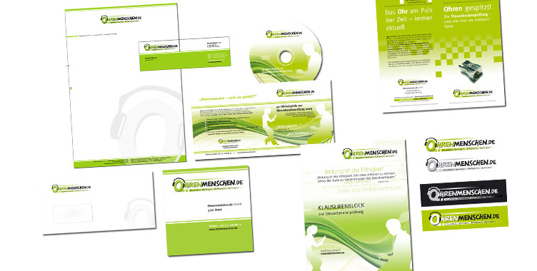 Ohrenmenschen.de - Begleitend zu den innovativen Produktentwicklungen für angehende Steuerberater, den AudioCards, wurden diverse Werbemaßnahmen entwickelt. Geworben wurde über Zielgruppenrelevante Zeitschriften und über Promotionaktionen an Universitäten. Der Kunde wurde mit allem versorgt, was für ein neues Produkt wichtig ist: Corporate Design, Imagebroschüre, Flyer, Gratis Hörprobe CD, Website-Design, CD-Verpackungen und -Labeling, Promotionmaterial, Give away-Gestaltung, und vieles mehr.